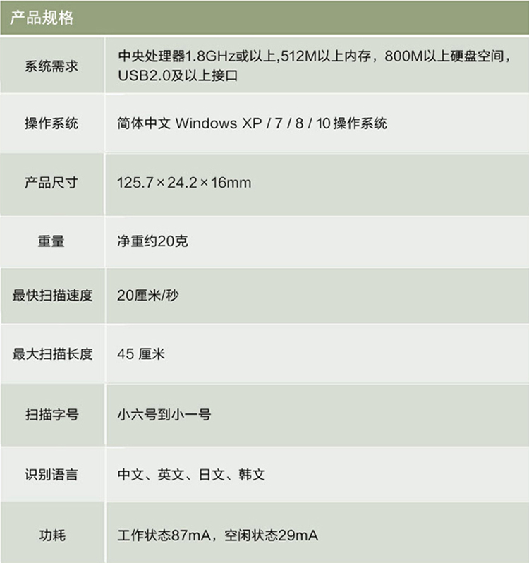 | 识别速度:1200字/分钟;小巧便携:净重30克! |